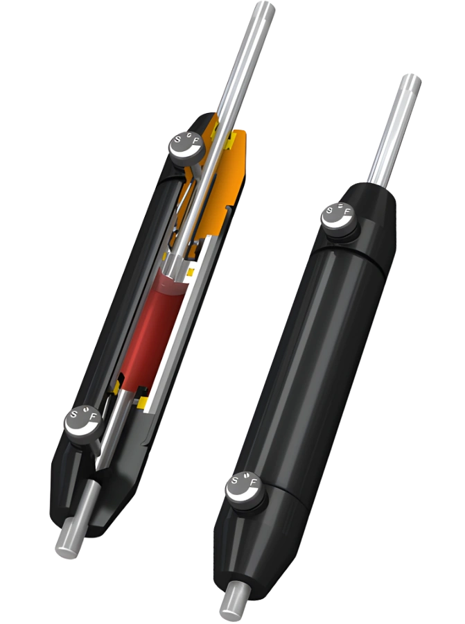 Los dampers hidráulicos de la familia DVC-32 son los primeros en permitir ajustar de forma independiente la velocidad de entrada y salida desde el exterior, logrando una regulación más precisa. Gracias a sus segmentos de ajuste separados para compresión y extensión, y a su funcionamiento activo en ambos sentidos, son adecuados como elementos de seguridad o control.