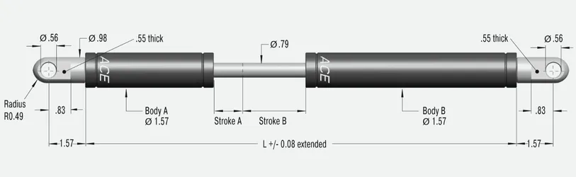 Los gas springs tipo empuje en configuración tándem de ACE son unidades listas para instalar, libres de mantenimiento y equipadas con dos cámaras de presión que generan fuerzas de extensión y curvas de progresión diferentes. Esto permite cubrir los distintos rangos de fuerza entre el inicio y el final del movimiento en una misma aplicación. Dichos rangos se ajustan para complementarse entre sí y son definidos individualmente para cada proyecto mediante el servicio de cálculo gratuito de ACE, fabricándose con precisión según la dinámica requerida.