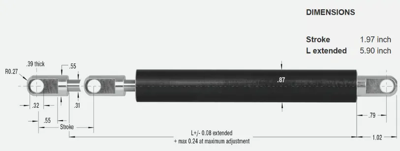 Ajuste: Se realiza girando el vástago cuando está completamente extendido o completamente comprimido. Giro en sentido horario = aumenta la amortiguación. Giro en sentido antihorario = reduce la amortiguación. La fuerza de amortiguación puede ajustarse antes de la instalación. El ajuste puede aumentar hasta 6 mm la dimensión L.