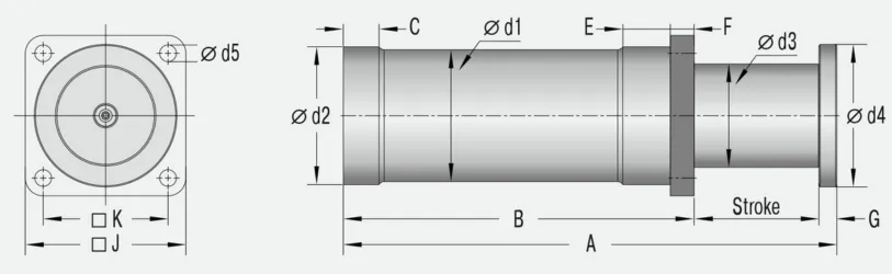 Materiales: Cuerpo exterior, Botón del extremo del vástago: acero pintado de gris; vástago del pistón: acero galvanizado