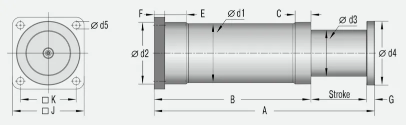 Materiales: Cuerpo exterior, Botón del extremo del vástago: acero pintado de gris; vástago del pistón: acero galvanizado